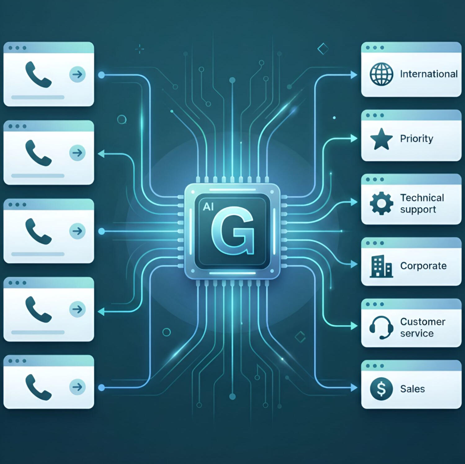 Route calls by department, location, or priority using intelligent AI logic that adapts to your business structure.”